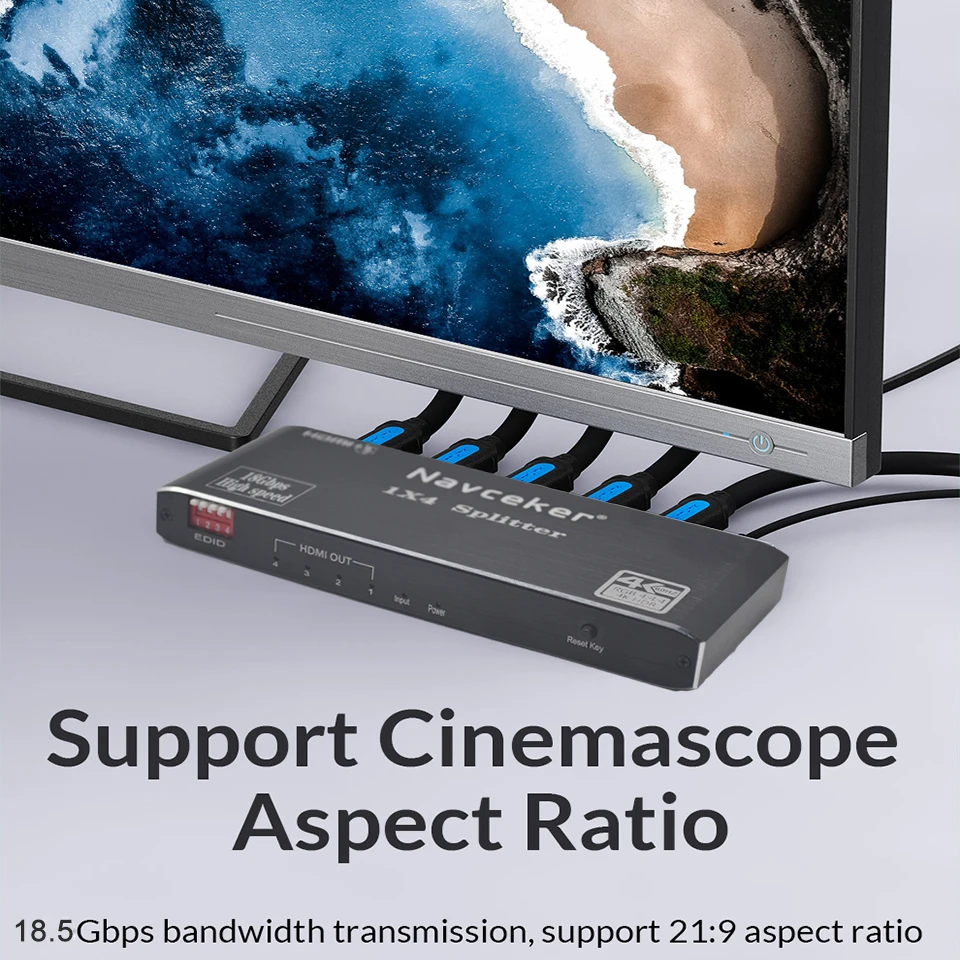 ZY-HS200, Navceker 1x2 1x4 HDMI 2.0b Splitter uses a single HDMI source,accessing to multiple HDMI sinks. It allows one HDMI device to be split easily to 2/4 HDMI compatible monitors or projectors. In addition,it can be placed at the end of a long HDMI cable to regenerate the HDMI signal. The resolution of this hdmi splitter can be up to 4Kx2K@60Hz.