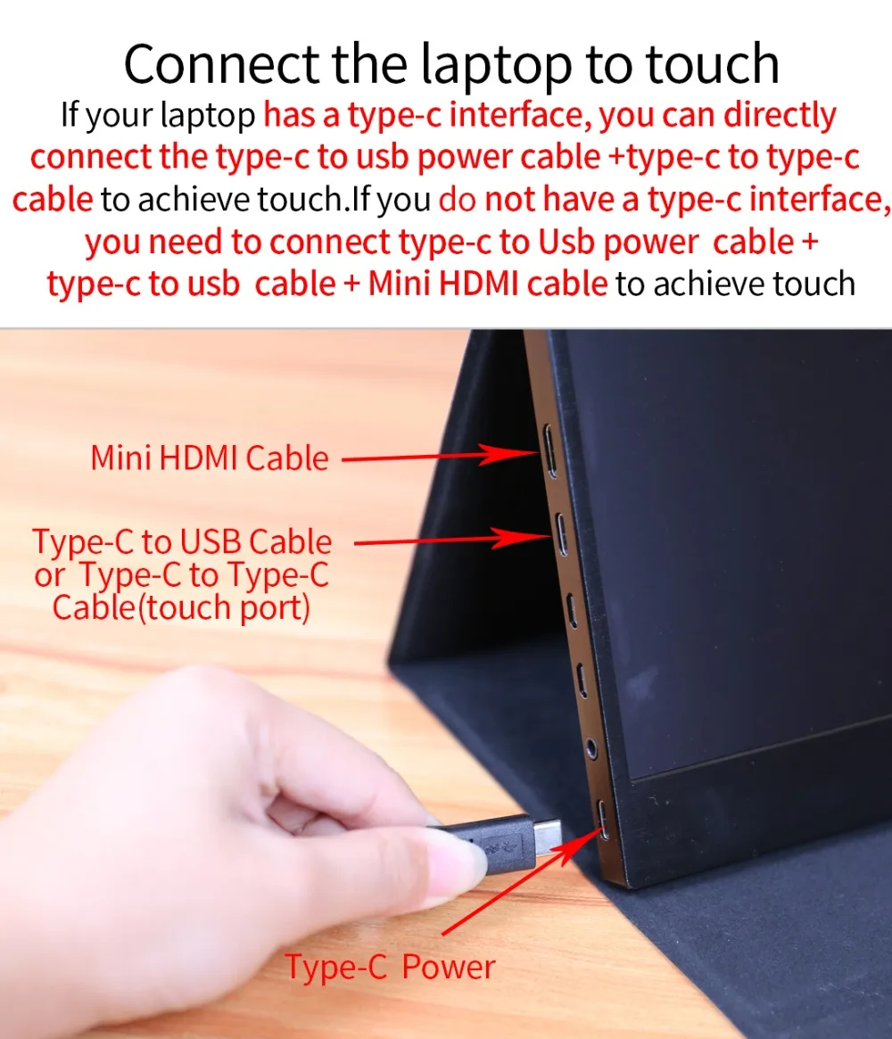 Please note:15.6 inch Type-c monitor and 15.6 inch Type-c touch monitor are different,This link picture all shows the pictures of 15.6 inch Type-c touch monitor,15.6 inch Type-c monitor Have Wall mounting hole,15.6 inch Type-c touch monitor No Wall mounting hole。