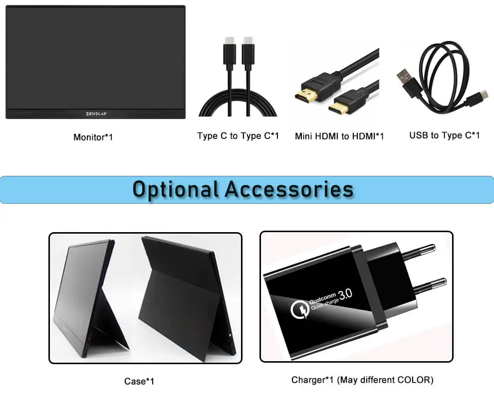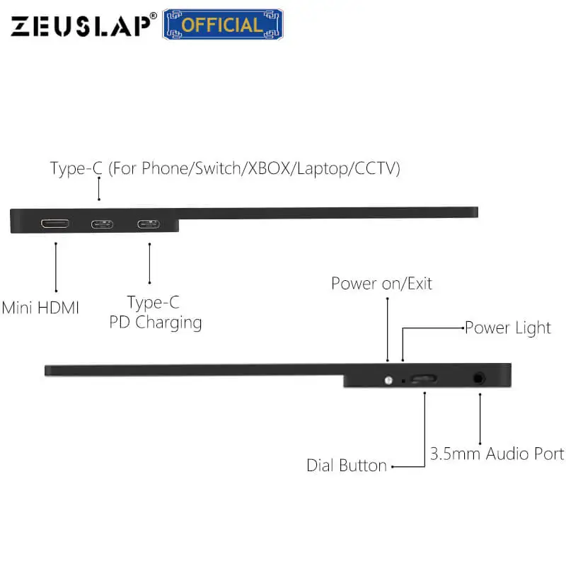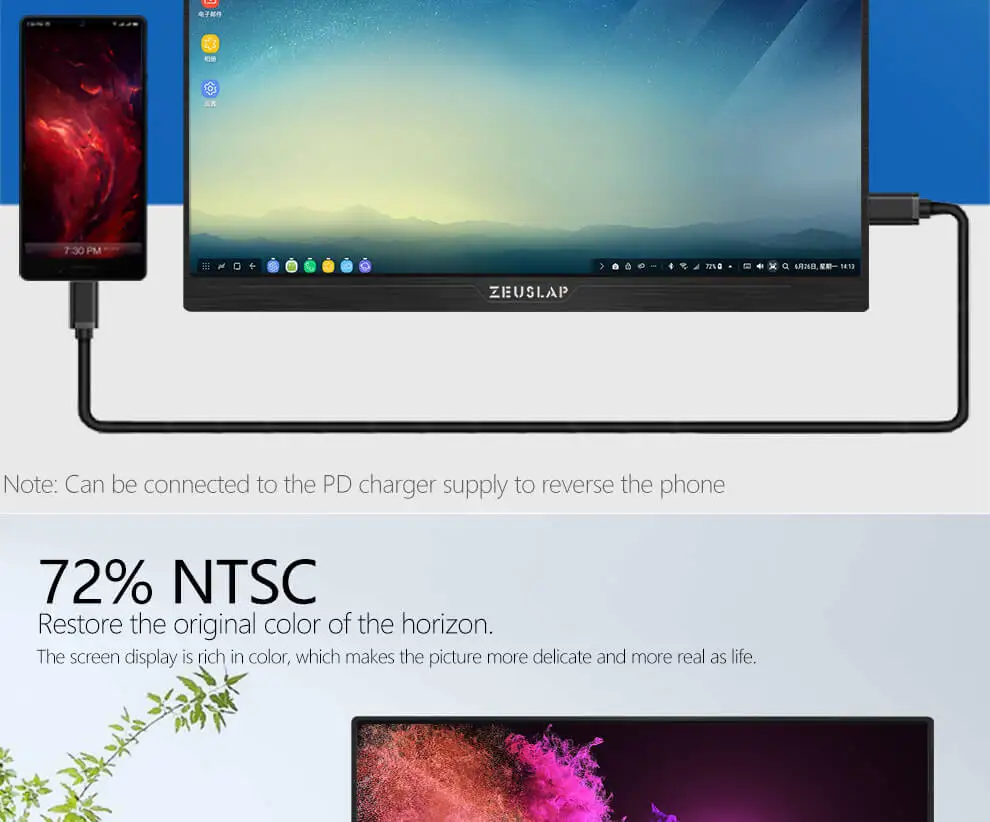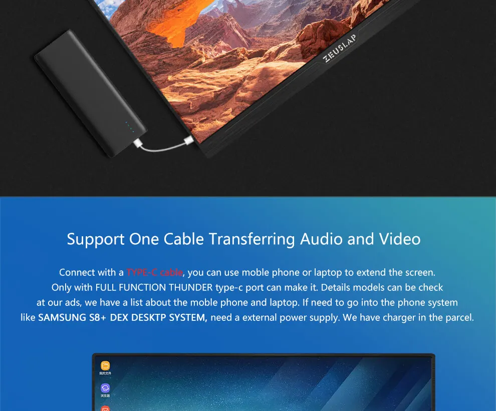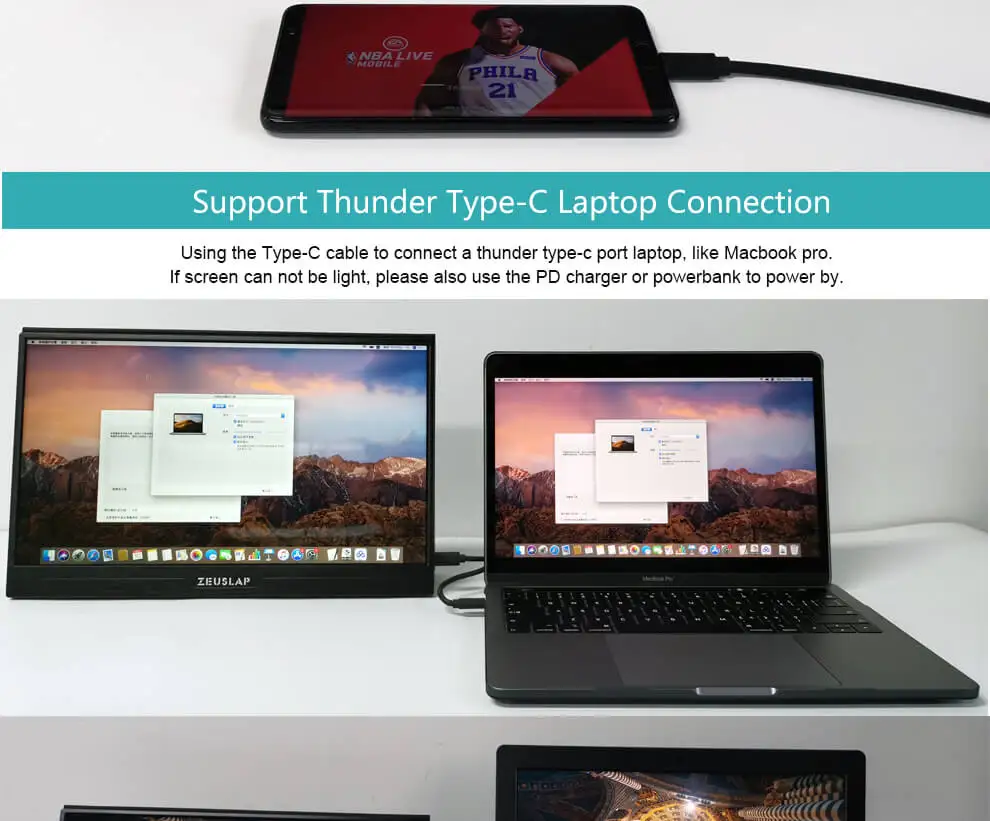 A: ZEUSLAP Portable Monitor only support the Thunder Type-C port mobile phone via TYPE-C cable.