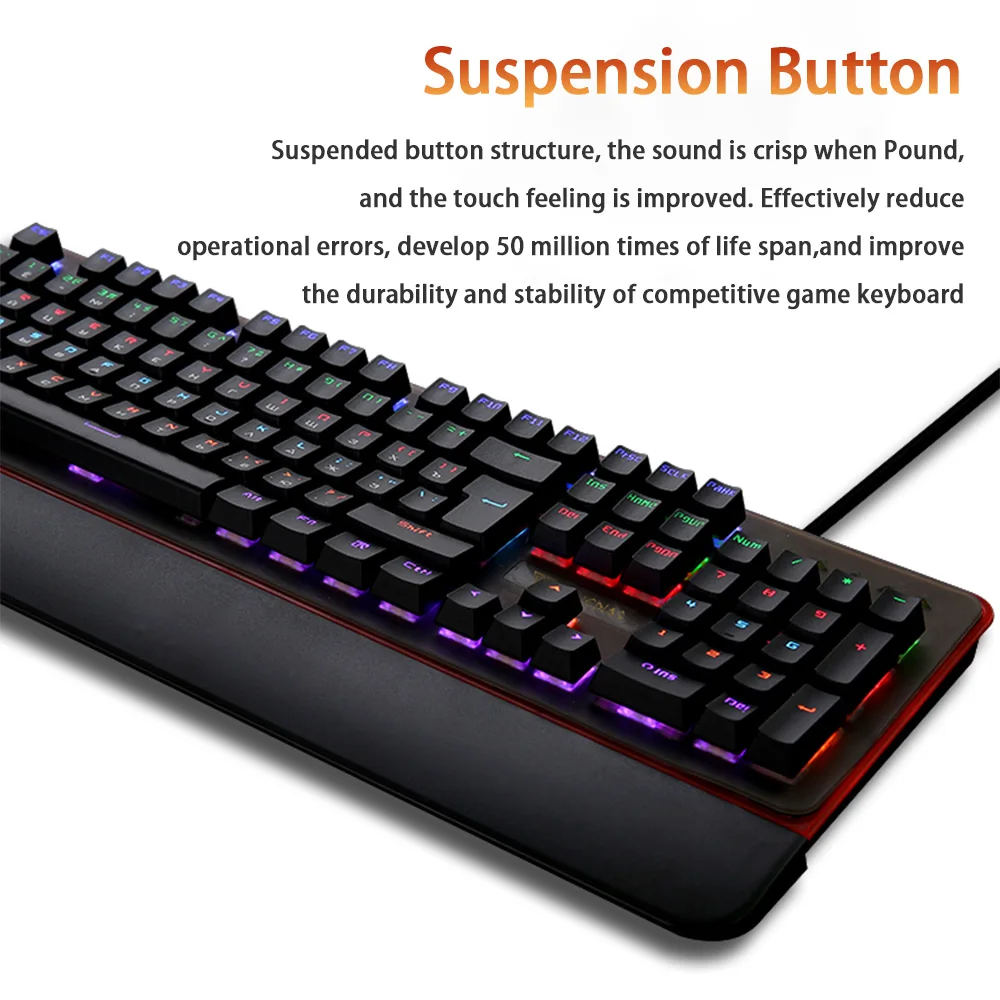 【Press the full key without impact】: support the full key without conflict, to avoid clicking multiple keys at the same time hand error, let you in the game process handy 【Suspension button】: Suspended button structure, the sound is crisp when Pound, and the touch feeling is improved. Effectively reduce operational errors, develop 50 million times of life span, and improve the durability and stability of competitive game keyboard 【Ergonomic design】: Ergonomic curved keycap with smooth lines,Scientific debugging, Curving with Palm movement, comfortable to touch 【Waterproof】: 1:1 waterproof protective film, metal panel 50 million times waterproof shaft, pattern lamp effect.